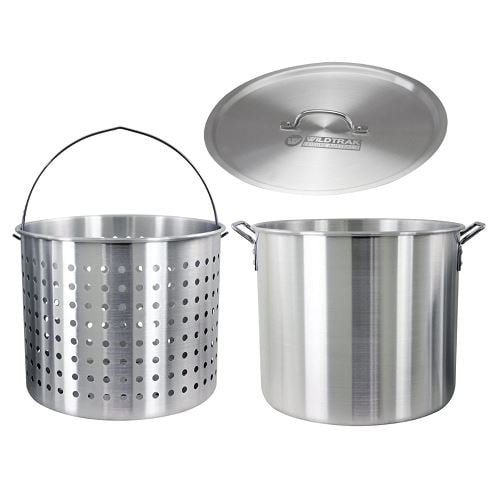 42 quart (40L) aluminium stockpot comes with a strainer basket. Perfect for cooking Crayfish, Prawns, Mussels and other seafood, Or use as a stockpot for catering soups and stews.