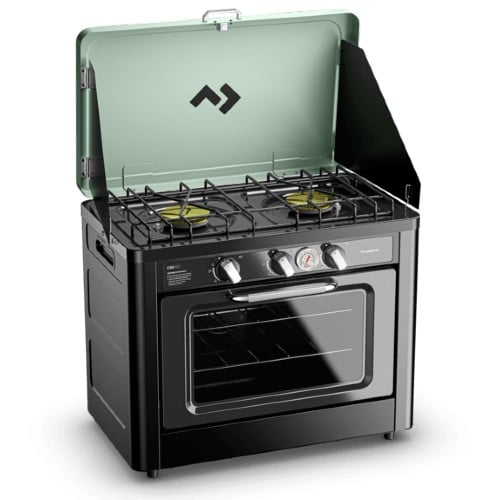 Two powerful brass burners with high heat output and 1kW oven with two cooking racks, ensures you can enjoy delicious hot food wherever you are. Built for the outdoors with a robust powder coated pressed steel construction and recessed carry handles for easy transportation. Easy push button Piezo ignition and windshields to ensure cooking isnt interrupted by the elements and also folds down to cover the cooktop when not in use. The non stick enamel cooking surface makes cleaning easy.
