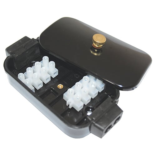 Quality bakelite box with brass fittings and rubber grommet giving waterproof cable entry points for multiple wire sizes.