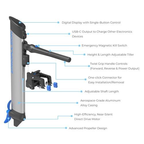 The ePropulsion eLite 500W electric outboard redefines your on-water experience with innovative features and commitment to sustainability. Designed to be the most compact and lightweight electric outboard in its class, it is an easy-to-use alternative to small internal combustion engines for enthusiasts worldwide. Perfectly blending efficiency and mobility, it represents a new era in clean, quiet, and eco-friendly marine propulsion.