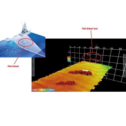 The 3D sounder history provides an intuitive and easy to understand 3D image of the seafloor, along with fish school icons. This mode is useful in a variety of situations, such as selecting a fishing hot spot and assessing the seabed condition.