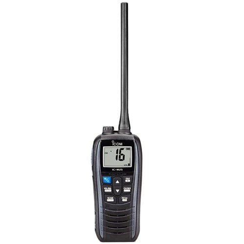 The IC-M25 has a slim and light weight body with large LCD and simple user interface. A IPX7 waterproof construction that floats and lets you know where it is with the flashing red LED light and LCD/key backlight.