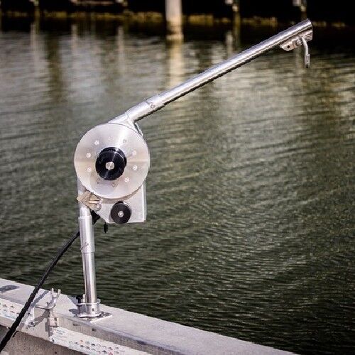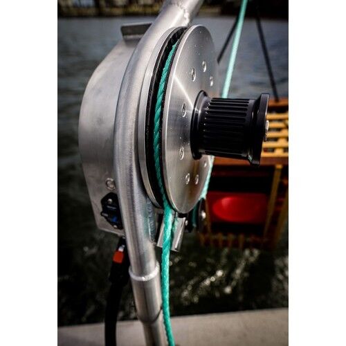 A 300mm large power sheave grips rope from 6mm-14mm with no slippage for hands free hauling and Self-Coiling rope guide. A suggested safe 350lb max pull & 150lb recommended working load with upto 50m per minute line speed for fast, easy retrieval of pots or lines.