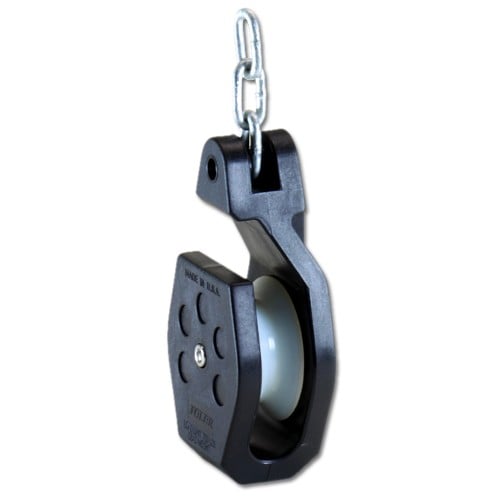 Open block pulley was built for the sportsman, but is strong enough to take on light commercial loads. The unique open end design makes for quick work and easy access. Features a nylon sheave with an Oilite bushing, and S/S chain top with shackle to resist twisting and returns to center.