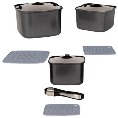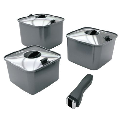 SmartSpace was designed to stack neatly inside the next. The revolutionary handle is removed and stored at the click of a button and interchanged between the pots.