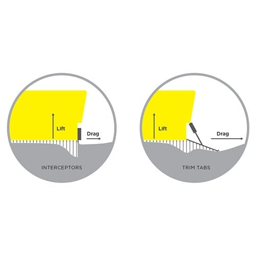 Interceptors provide less resistance compared with traditional trim tabs, Zipwakes interceptor blade extends just 30mm, whereas trim tabs often project 150 mm reflecting substantial drag. Significantly enhances performance, fuel economy, comfort and safety when accelerating, turning or running in a seaway.